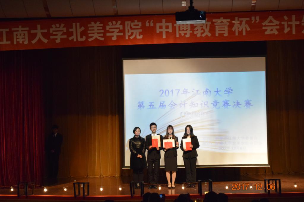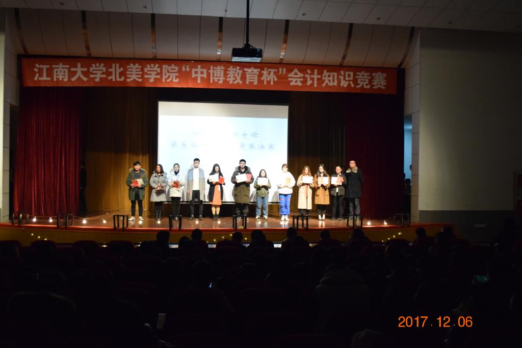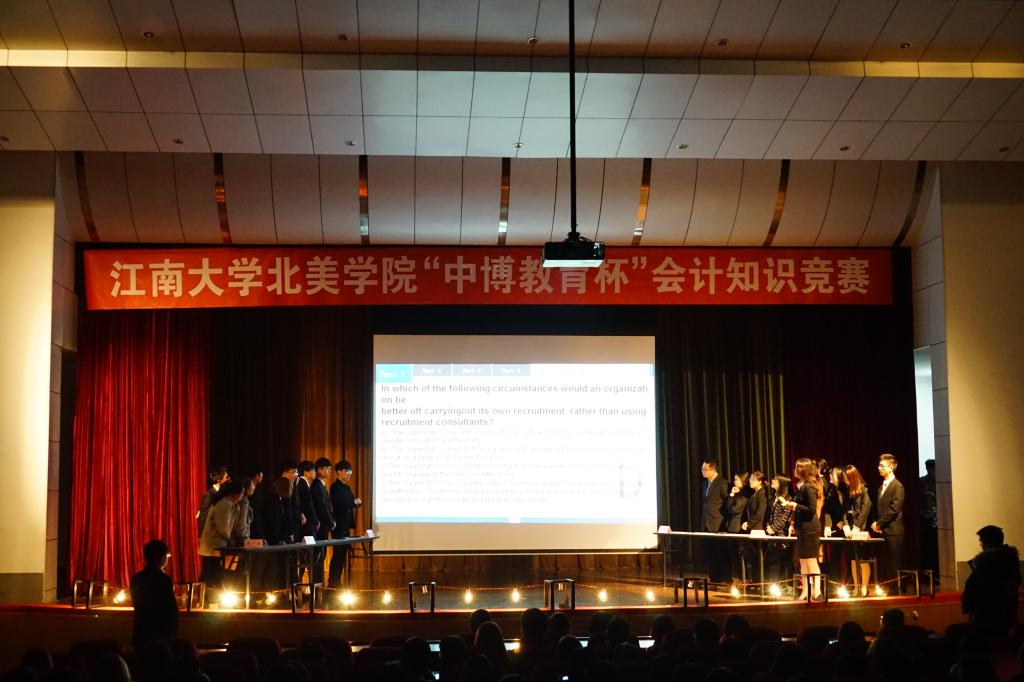 为深入贯彻落实党的十九大精神,拓展就业渠道,实现高质量就业,2017年12月6日晚6点30,江南大学第五届会计知识竞赛在南区活动中心报告厅隆重举行。出席本次活动的嘉宾有中博教育无锡分部总经理林巧云,中博教育无锡分公司财经项目经理袁铭江,国际教育学院与北美学院党委副书记副院长荆燕,国际教育学院与北美学院分团委书记、学工办主任朱琳,北美学院学工部主任张慧,北美学院分团委副书记兼学生会指导老师任振宇,以及各年级组组长和辅导员老师。